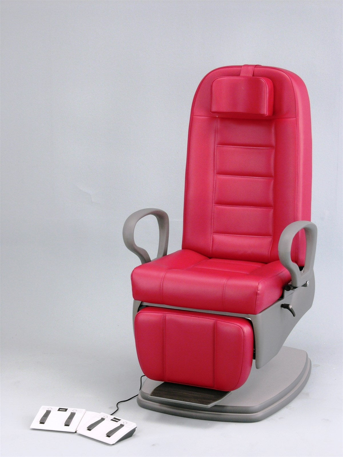 Ophthalmic chair that is convertible into bed electrically and that was designed to eliminate the problems that doctors often have when they have to make patients lay down. By acting on the foot-switch control, both the wide backrest and the leg rest are moved synchronously from vertical to horizontal position by a silent electric motor, transforming the chair in a real small bed for tonometry, dressings and small surgical operations. DOCTOR chair is the best chair for ophthalmologists, ENT doctors and doctors of all specialities. The chair is also provided with electric height adjustment, tip-up and lockable armrests, 135° left & 135° right lockable rotation, fixed footrest, cushion headrest.