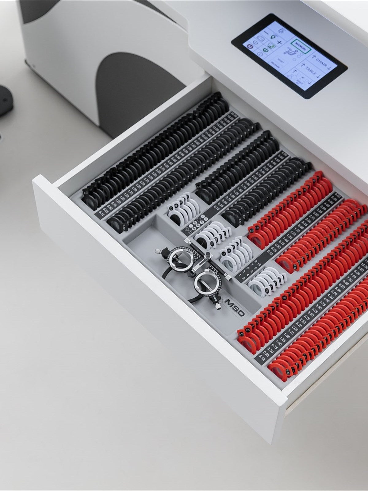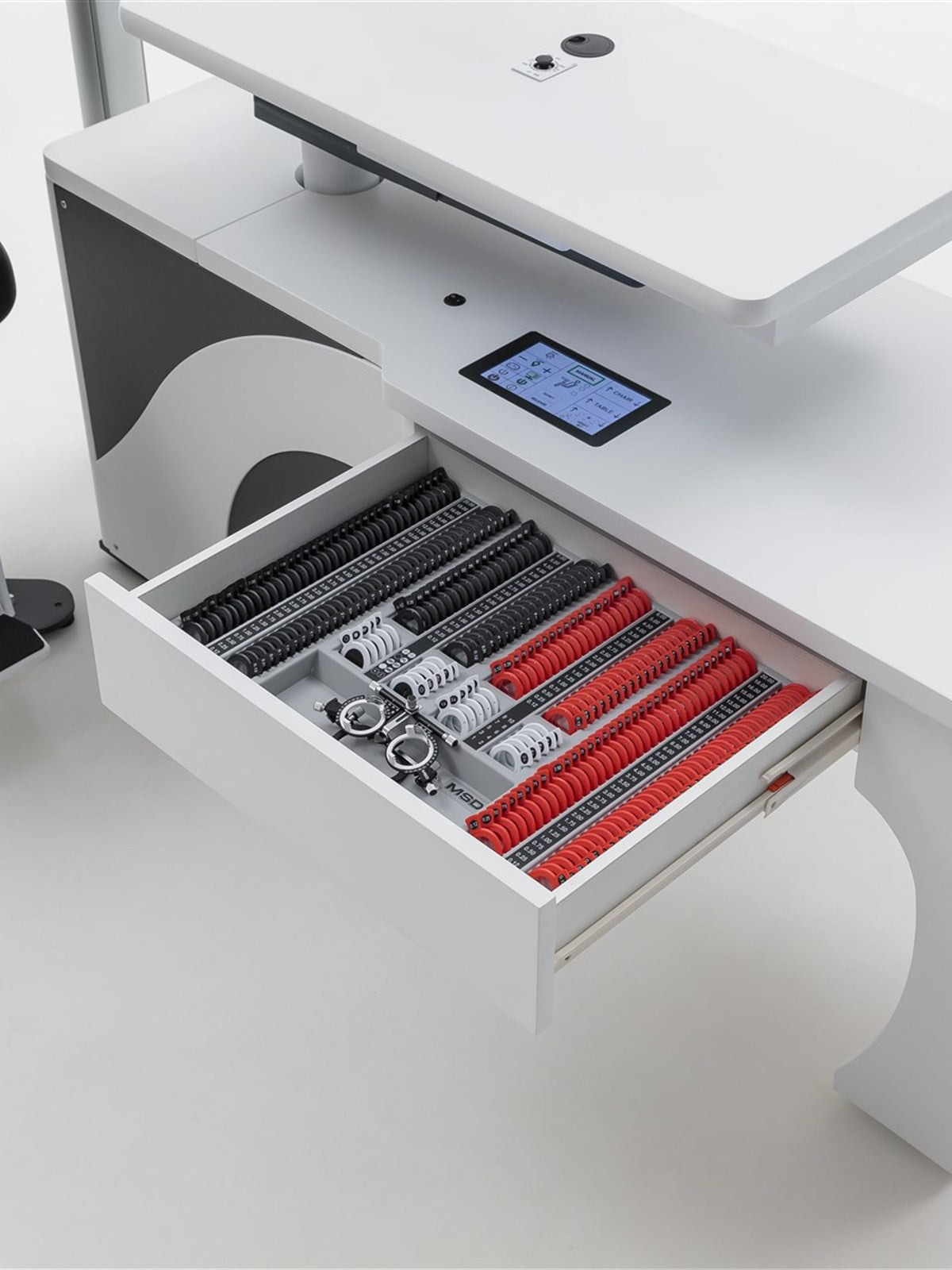 400630 EASYVISUS RM64 REFRACTION UNIT WITH ELECTRICAL HEIGHT ADJUSTABLE ROTATING TABLE TOP FOR TWO INSTRUMENTS PROVIDED WITH DRAWER WITH WOODEN TRAY FOR 148 TRIAL LENSES - DESK WITH DRAWER (two drawers in total)