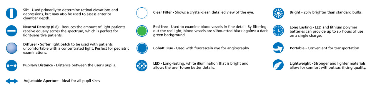 All slit lamps in the H-style range come with a clear, red-free, yellow barrier filter, neutral density, diffuser, and blue filter permanently installed.