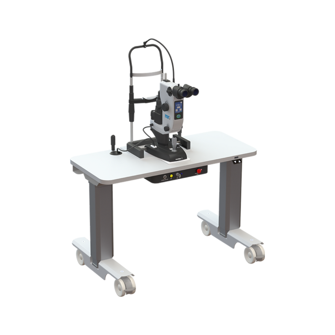 MRQ is ideal for any practice size. The laser can be installed on an existing height- adjustable evaluation stand as a space-saving stand-alone unit. Meridian Medical offers two motorized tables: a wheelchair-friendly, twin-column table presenting excellent ergonomics for patients and doctors and a single column for small areas. The ergonomic positioning of the handles on the chinrest guarantees a comfortable sitting position for the patient, thus increasing the patient comfort.